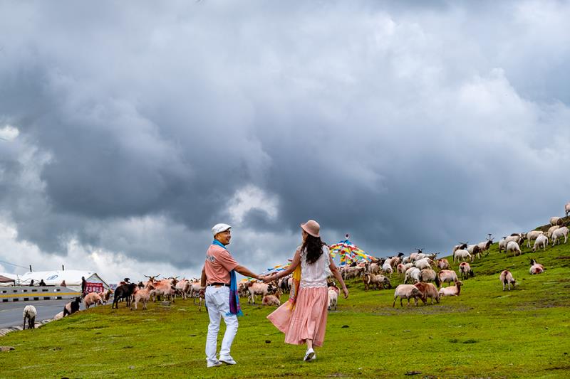 作品概括: 青青草原白云飄,山上牛羊遍地跑,有對伉儷肩并肩,幸幸福美滿把手牽