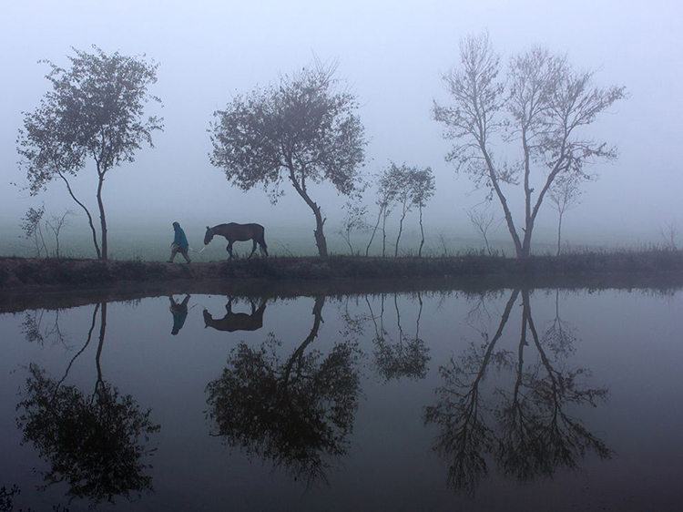冬季,巴基斯坦旁遮普的錫亞爾科特,一名當(dāng)?shù)厝藸恐R走在岸邊。