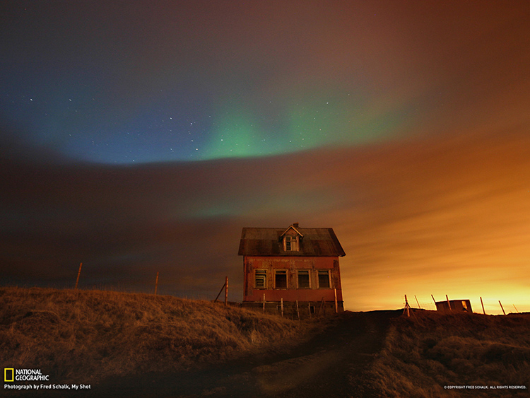 冰島雷克珍半島上空的絢爛北極光,由攝影師弗萊德-斯查克拍攝。斯查克表示:“預(yù)報(bào)稱(chēng)當(dāng)天晚上會(huì)出現(xiàn)北極光,于是我決定在雷克珍半島找個(gè)理想地點(diǎn)拍攝。不過(guò),當(dāng)晚的夜空并不配合,尤其是遠(yuǎn)處的夜空。后來(lái),我在一座廢棄的房屋附近停下來(lái),這里的云相對(duì)少一些。這幅照片我很滿(mǎn)意,云、夜空中的藍(lán)點(diǎn)、綠色的北極光以及雷克雅未克城市燈光的橙色倒影交織在一起,共同打造一場(chǎng)絢爛的多彩光秀!