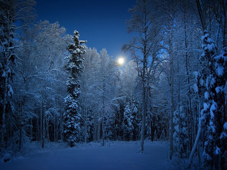 傍晚時(shí)分,美國(guó)阿拉斯加州北極地區(qū),霜樹(shù)在滿(mǎn)月的映襯下多了一份神秘色彩,夜空也被月光染成鈷藍(lán)色。