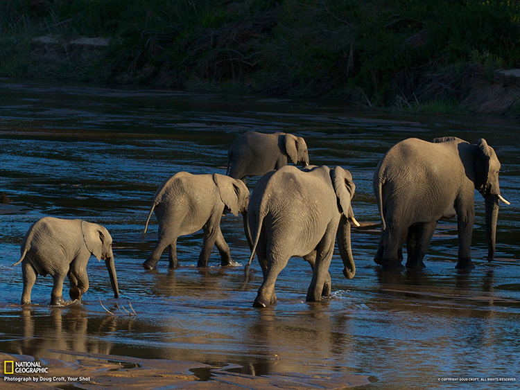 南非馬拉-馬拉動(dòng)物保護(hù)區(qū)的一群大象,正在穿過(guò)桑德河。攝影師道格-科洛夫表示:“我們坐在車(chē)?yán)锬慷脦讉(gè)象群渡過(guò)桑德河,可能有150頭左右。隨著光線(xiàn)的變化,眼前的景象越發(fā)給人一種超現(xiàn)實(shí)的感覺(jué)。”