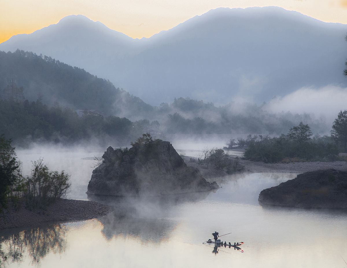 作品介紹: 清晨,楠溪江上水霧蒸騰,遠(yuǎn)山破曉泛紅。一葉竹筏泛江上,長(zhǎng)棹漁影譜晨曲。