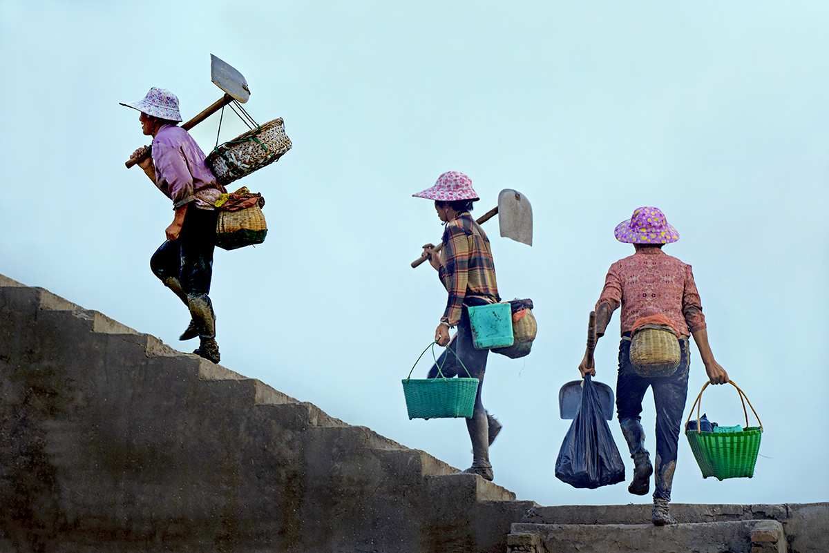 作品介紹:  夕陽(yáng)西沉,潮退灘露,漁船回港排灘頭,三三兩兩的討小海為業(yè)的漁民身背漁簍趟泥涉水歸岸。我站在堤壩下方,手提長(zhǎng)焦鏡頭相機(jī),選好角度,待三名漁民登上堤壩臺(tái)階,進(jìn)入鏡頭最佳位置,連續(xù)按下快門(mén)。