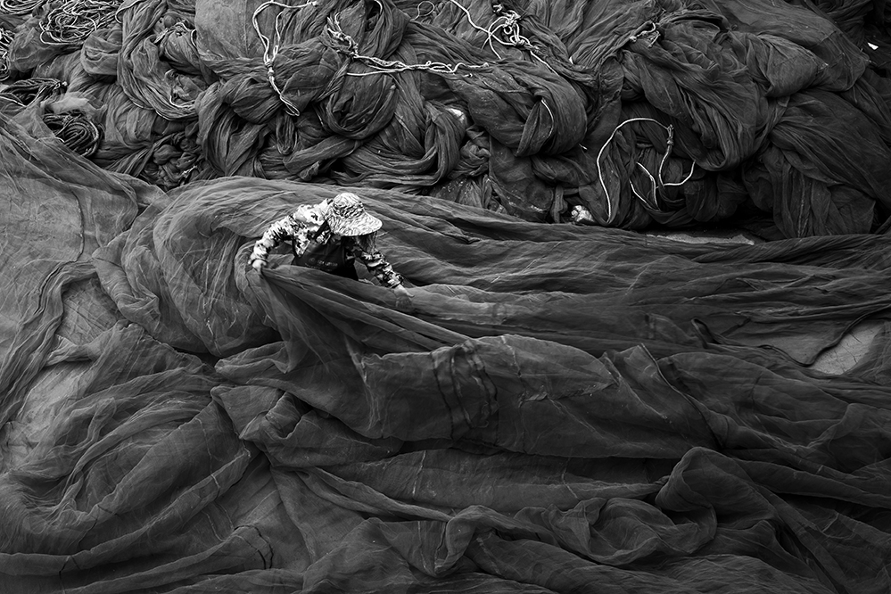 漁民抓緊修補漁網(wǎng),準備再次出海捕撈。2018.4,蒼南