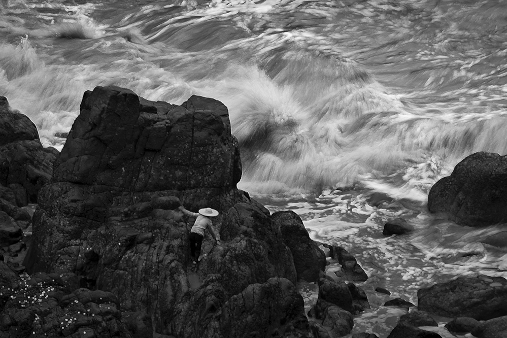 漁民攀爬上布滿苔蘚的濕滑巖壁上尋找貝殼類海鮮。2016.7,蒼南