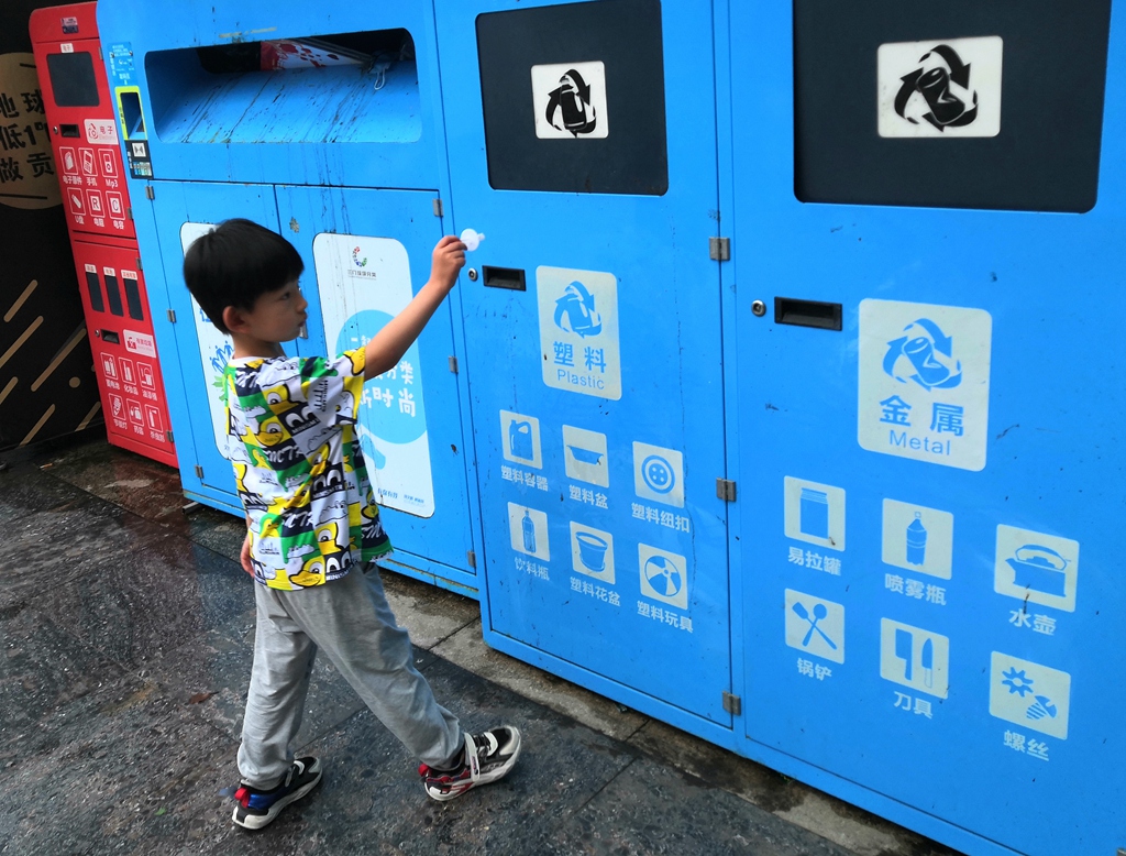 返回頂部>> 照片說(shuō)明: 孩童將冰棍塑桿投進(jìn)可回收箱