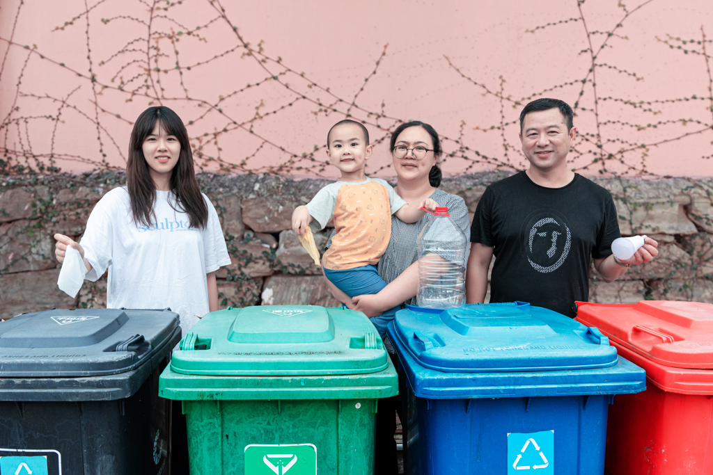 七零后父母,零零后姐姐,一零后弟弟,一家四口,來照個另類全家福,宣傳垃圾分類,就從小家做起。