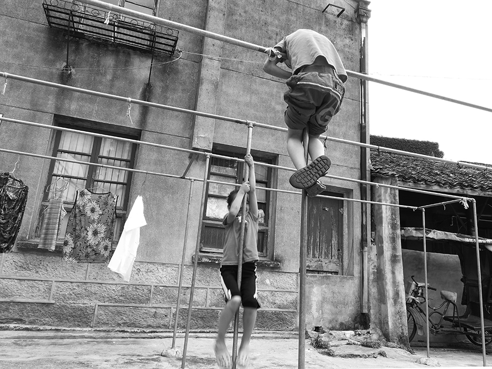 (組照十三)2017年5月,東門路94號門口,在晾衣架上玩耍的孩子