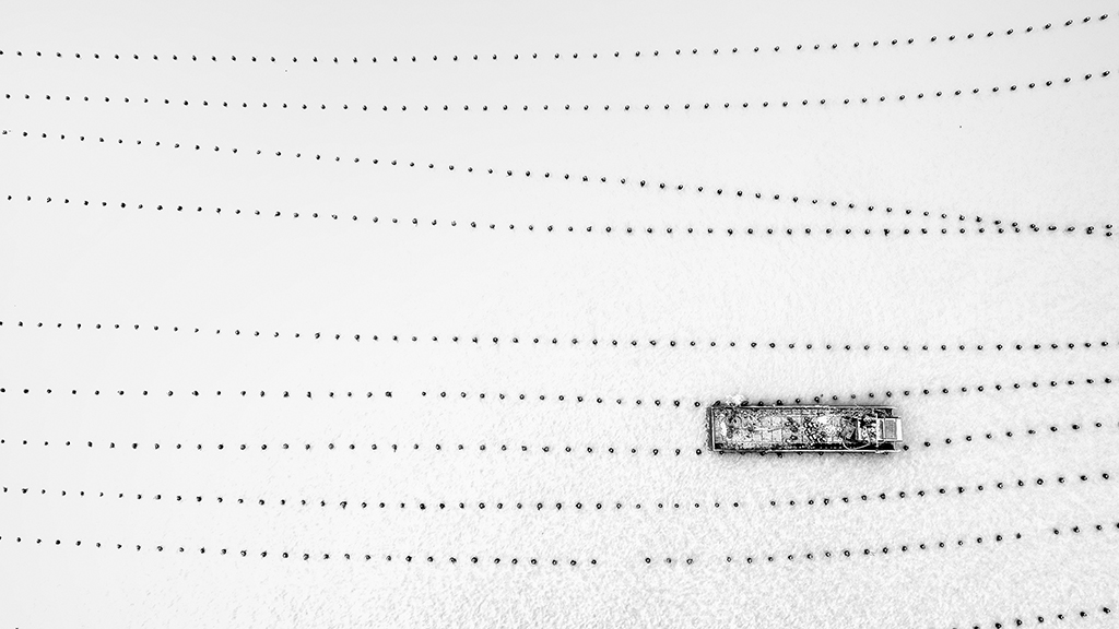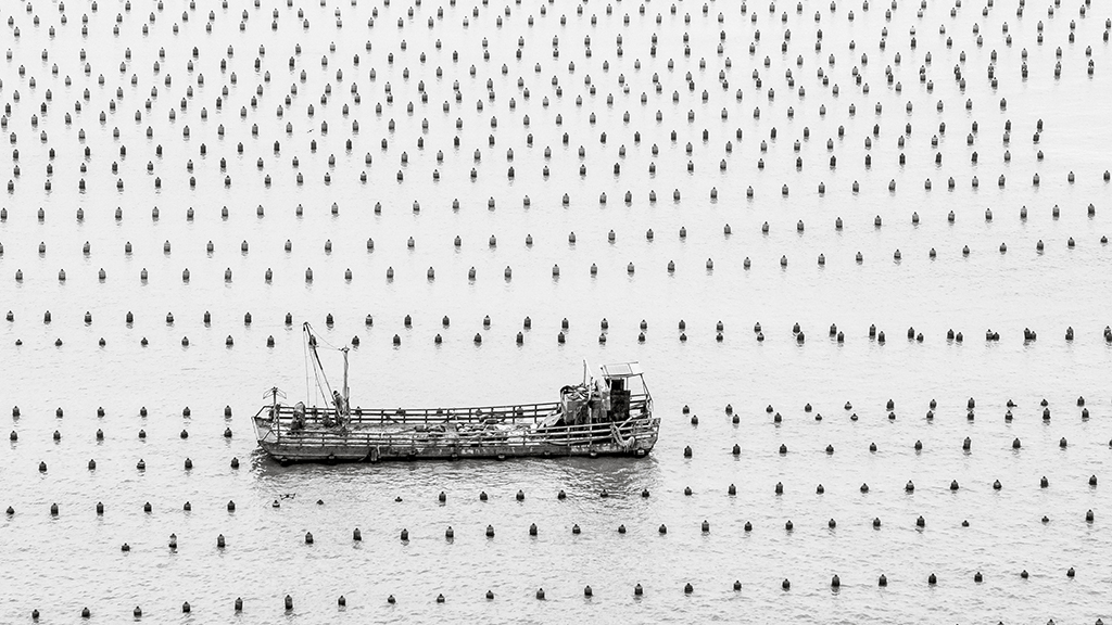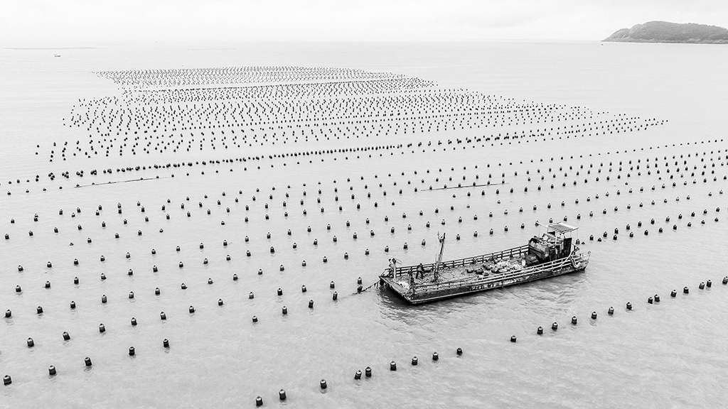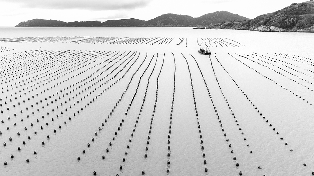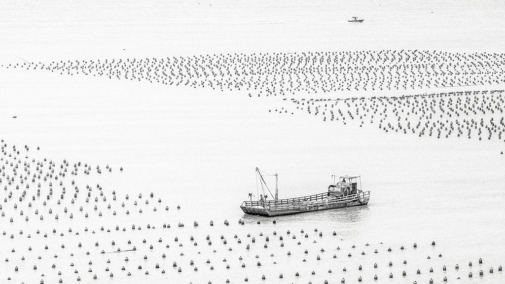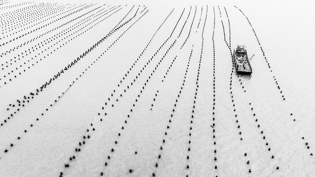 作品介紹: 溫州蒼南168黃金海岸是省內(nèi)別具山海資源特色的生態(tài)海岸帶,北起炎亭鎮(zhèn)崇家岙村,南至浙閩省界沿浦鎮(zhèn),這里擁有浙江最長的自然海岸線,海岸帶全長約168公里,海水優(yōu)良,海上資源豐富。這一帶的漁民本著靠海吃海的理念,開辟了許多海上養(yǎng)殖區(qū),本組作品就是其中的一處,那露出海面的飄浮標(biāo)志構(gòu)成了一條條整齊多變的線條,與海上作業(yè)的船只構(gòu)成了點、線組合的簡潔而唯美的畫面。
