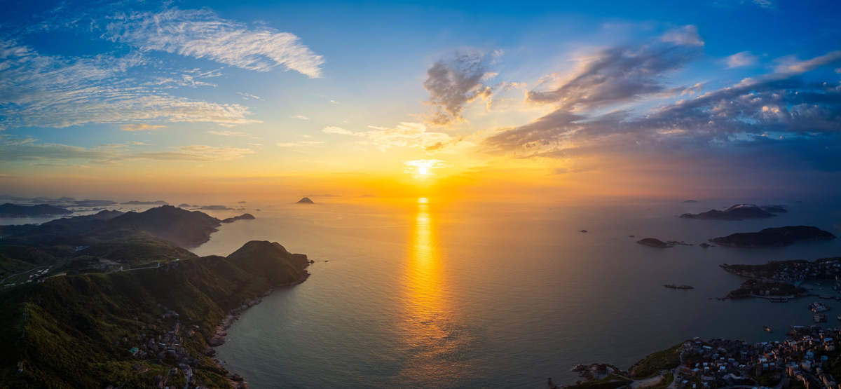 作品介紹: 溫嶺松門(mén)鎮(zhèn)清晨時(shí)分壯麗的日出景象。從高處俯瞰,太陽(yáng)正在海平面上緩緩升起,將天空染成一片金黃和橙色,與遠(yuǎn)處的云朵交織在一起,形成一幅美麗的畫(huà)卷。在陽(yáng)光的照射下,海水呈現(xiàn)出深淺不一的藍(lán)色,并反射出耀眼的光芒。周?chē)⒉贾恍┬u和山丘,它們靜靜地矗立在海面上,沐浴在初升的陽(yáng)光之中。