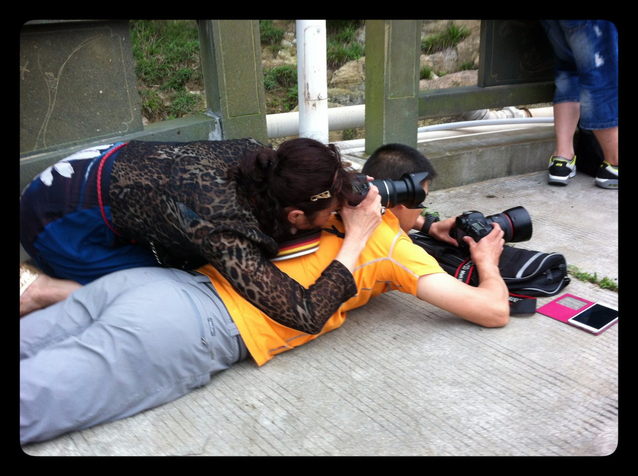早上在廊橋上拍攝瑜珈,攝影師為了尋求最佳角度,攝姿千奇百態(tài)。
