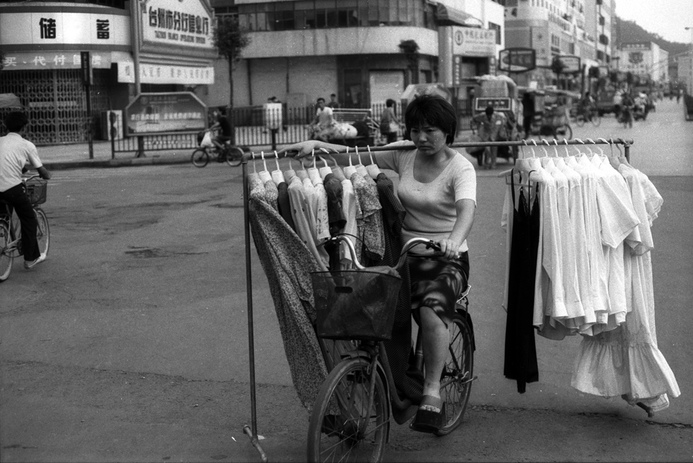 擺夜攤的婦女扛著衣服騎車經(jīng)過解放北路。夜市是傍晚至深夜的馬路市場(chǎng),主要經(jīng)營服裝和日用小百貨。