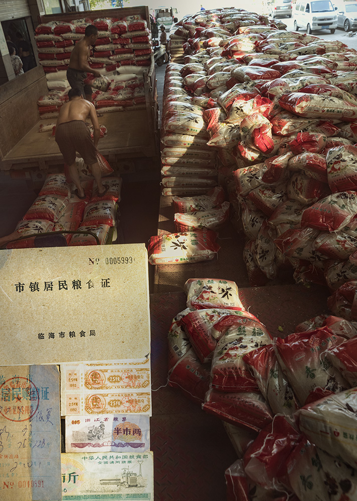 用多重曝光的方法,將糧票置于糧食自由貿(mào)易場景中。 通過本圖片講述了改革開放初期百姓的購糧必須用本地糧票,出差外地要用全國通用糧票,改革開放后的二十世紀90年代還用過購糧證。現(xiàn)在的百姓購糧只要鈔票自由貿(mào)易。圖片反應(yīng)了40年的糧食供給變化。