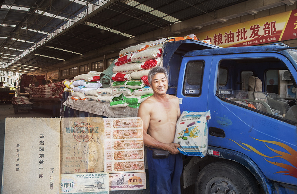 用多重曝光的方法,將糧票置于糧食自由貿(mào)易場景中。 通過本圖片講述了改革開放初期百姓的購糧必須用本地糧票,出差外地要用全國通用糧票,改革開放后的二十世紀(jì)90年代還用過購糧證。現(xiàn)在的百姓購糧只要鈔票自由貿(mào)易。圖片反應(yīng)了40年的糧食供給變化。