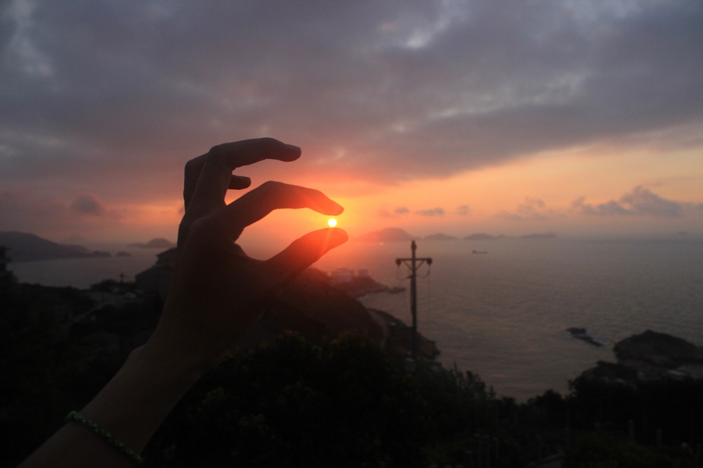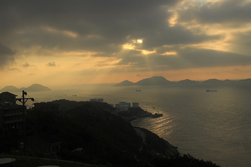 太陽被好像破了洞的云層遮擋住了,陽光從洞中射在了海面上。