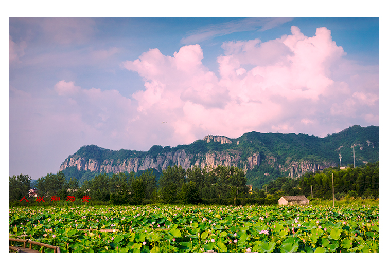 十里鐵甲龍,天空祥云漂,山下荷花盛開。