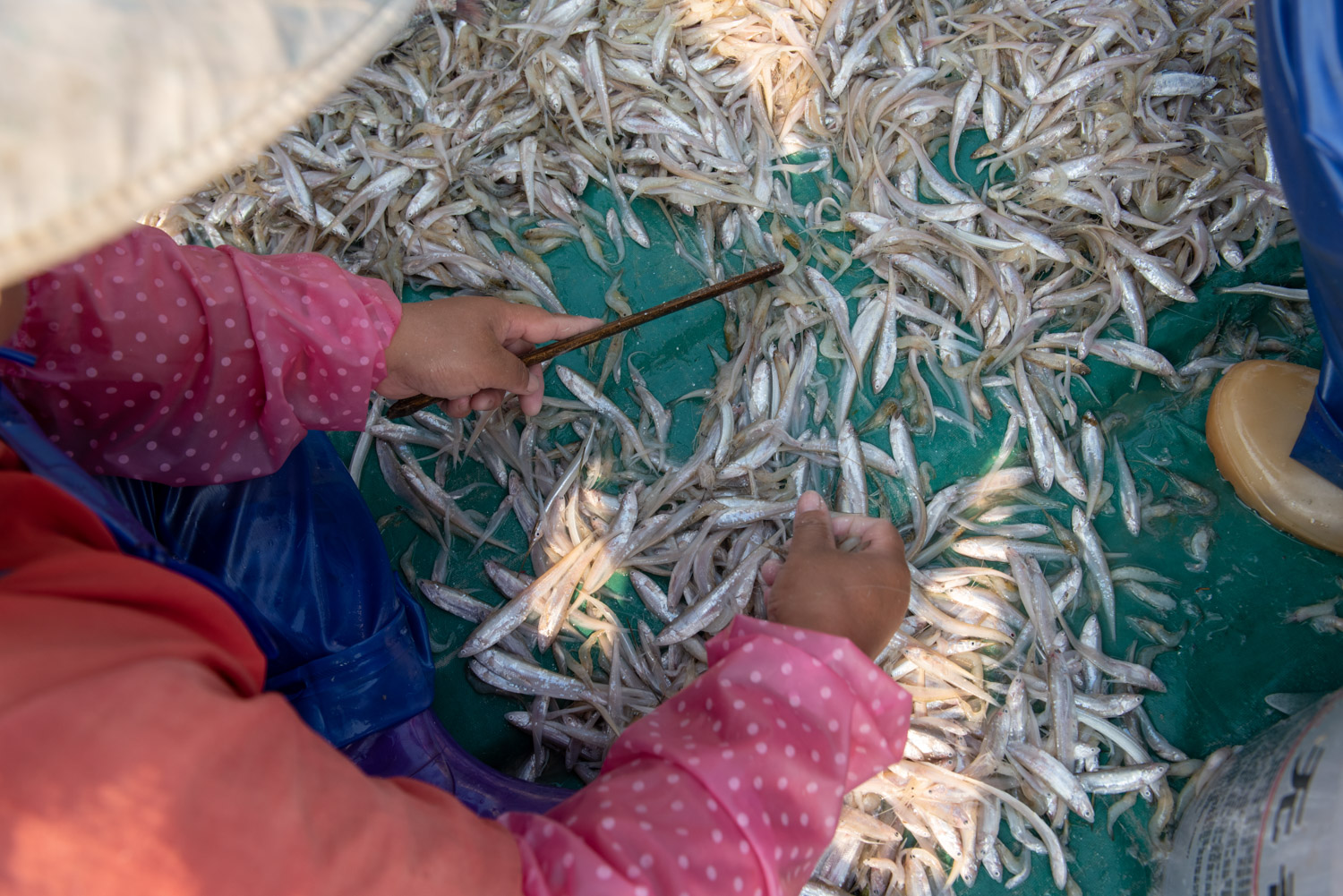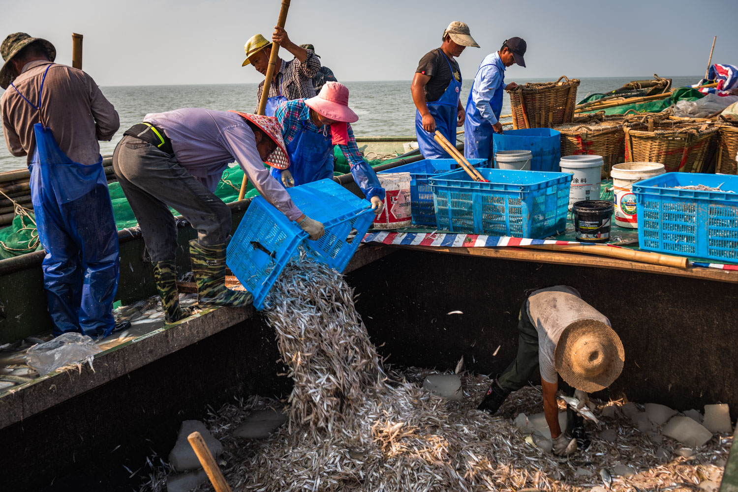 返回頂部>> 照片說(shuō)明: 收緊小網(wǎng)后,船靠上去撈魚,現(xiàn)代漁民其實(shí)自己已經(jīng)不再下網(wǎng)捕魚。