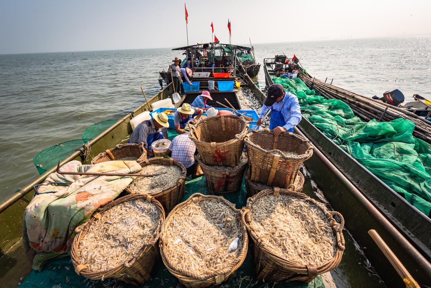 返回頂部>> 照片說(shuō)明: 魚蝦分揀后分別裝入框中和船艙。