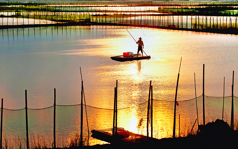 養(yǎng)殖漁民正在魚塘內(nèi)劃船喂投魚飼料