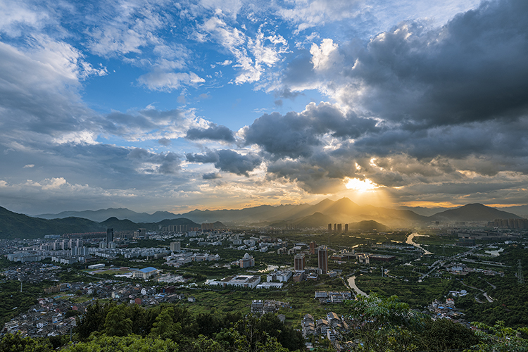 金色的陽光沖破烏云的阻礙,照耀在溫州茶山大學城上空,仿佛天空開了一扇窗。