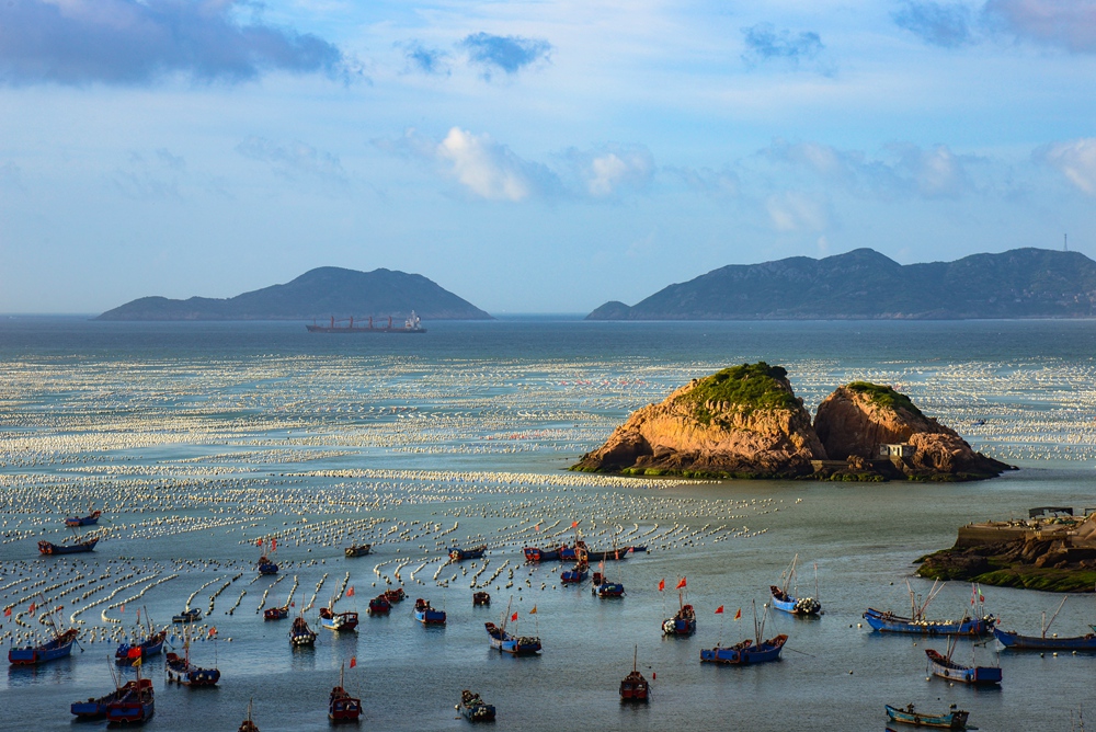 海上養(yǎng)殖牧場在夕陽照射下顯得更壯觀
