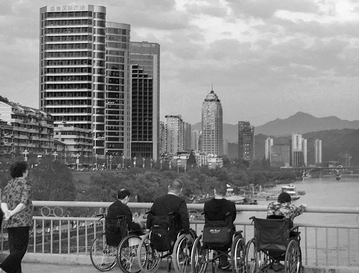 一群行動(dòng)不便的人坐著輪椅相約在橋頭,欣賞美景,一位大媽在旁邊關(guān)照著他們。