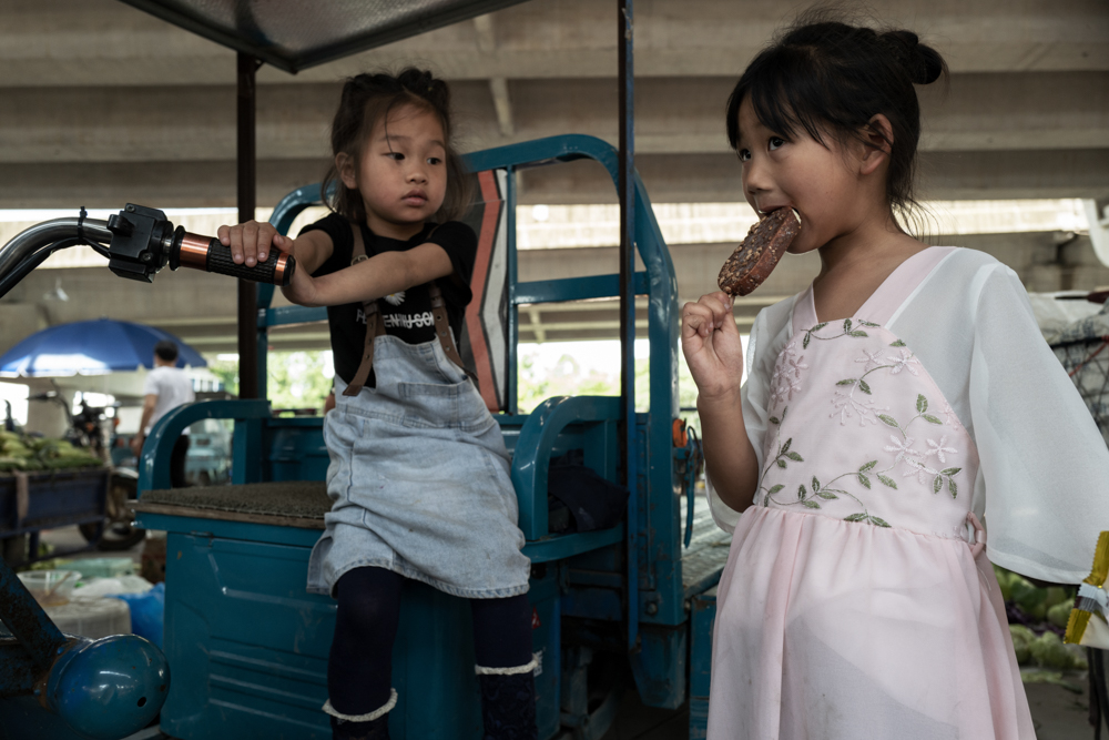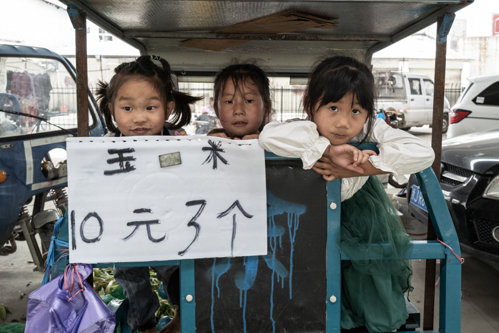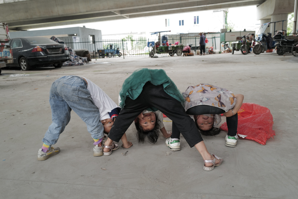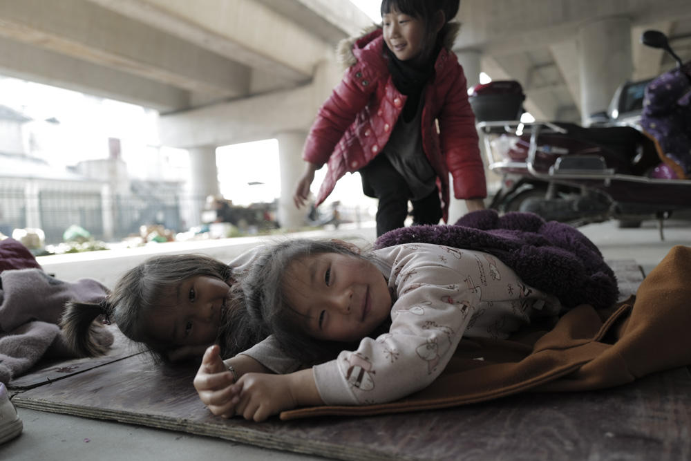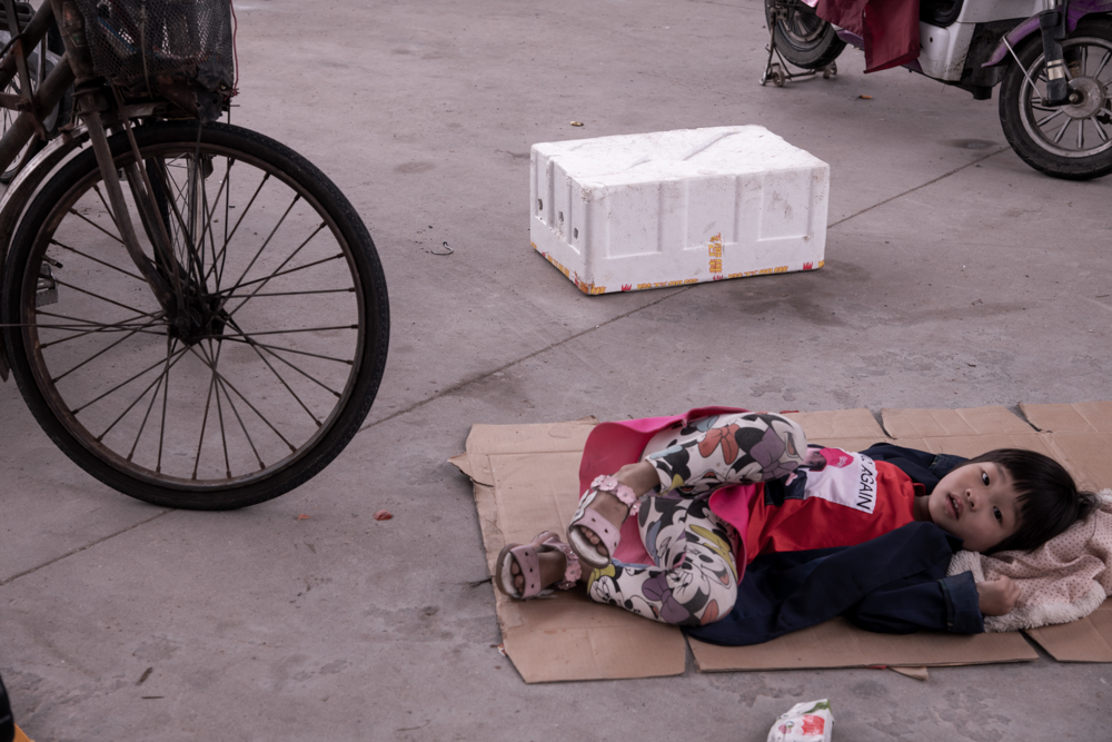 作品介紹: 有一群以趕集為營生的外地人,他們早上天沒亮就起床,載著菜帶上還沒睡醒的孩子,來到菜場擺攤,在空地上鋪上紙板、木板供孩子們休息。孩子們一起玩耍,塑料袋、網(wǎng)袋、木棍、繩子、蔬菜等都能成為她們的玩具;黃瓜、西紅柿是她們的零食,小女孩們也愛臭美,當我拿起相機,她們就會擺起剪刀手。菜場里有她們的歡歌笑語,也有她們的孤獨沉默。她們也是父母的寶,父母們不愿與孩子分開,所以不怕辛苦都隨身帶著。