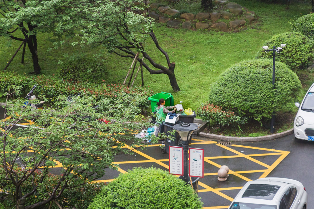 作品介紹: 小區(qū)的清潔工正在對(duì)住戶投放的垃圾再一次進(jìn)行分類,確保運(yùn)送到垃圾中轉(zhuǎn)站的分類準(zhǔn)確無誤。
