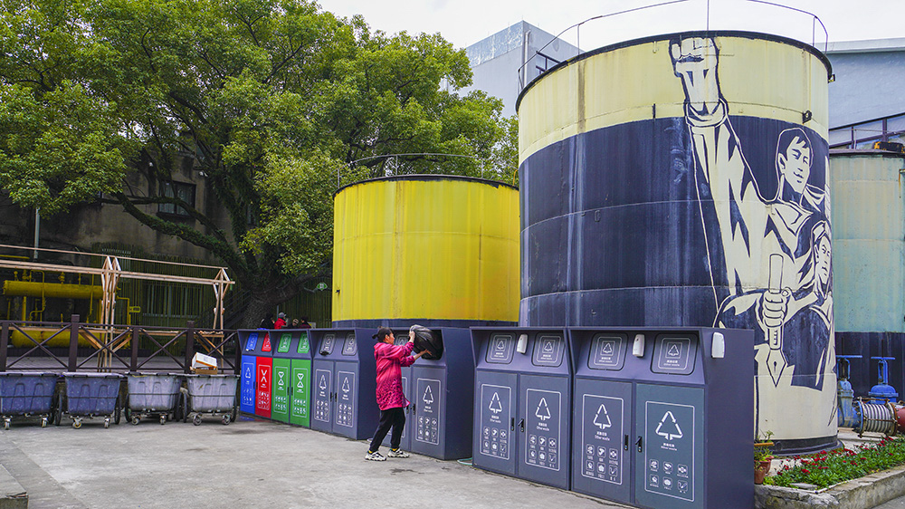 這個垃圾分類點的背景是原糧庫的大油桶,現(xiàn)在四周畫上了懷舊風(fēng)格的墻畫,更顯文明優(yōu)雅,是我見過的最美垃圾分類點。