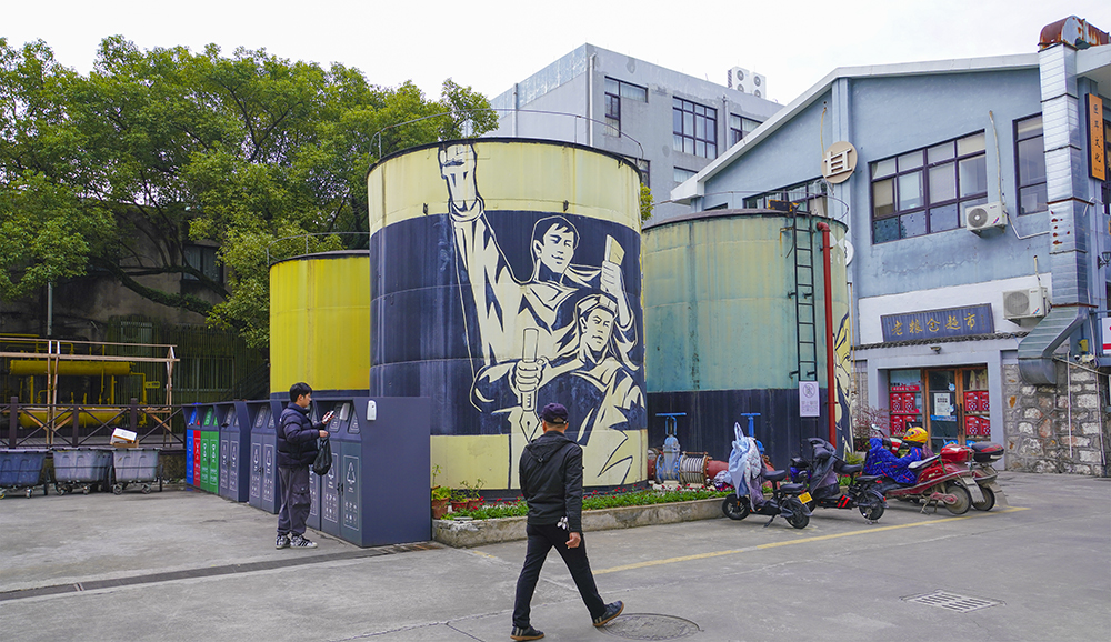這個垃圾分類點(diǎn)的背景是原糧庫的大油桶,現(xiàn)在四周畫上了懷舊風(fēng)格的墻畫,更顯文明優(yōu)雅,是我見過的最美垃圾分類點(diǎn)