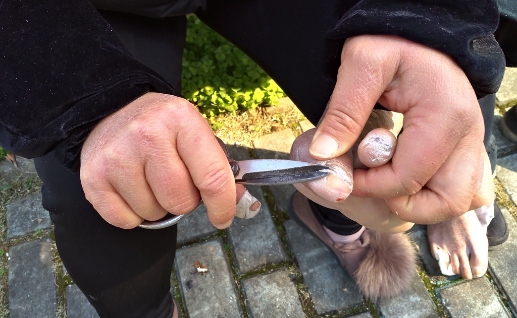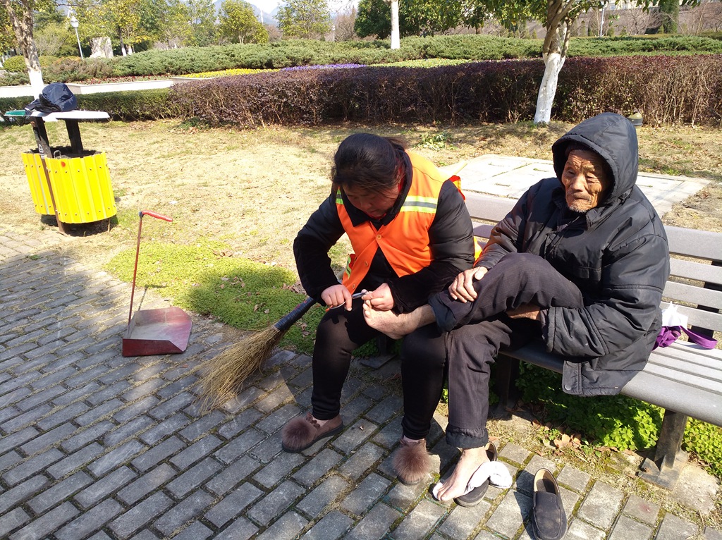 作品介紹: 環(huán)衛(wèi)工清掃分類小憩時(shí),見公園內(nèi)一老人無(wú)法剪腳指甲,就不怕臟,主動(dòng)為老人剪了甲,樂(lè)得老人愜意的笑。