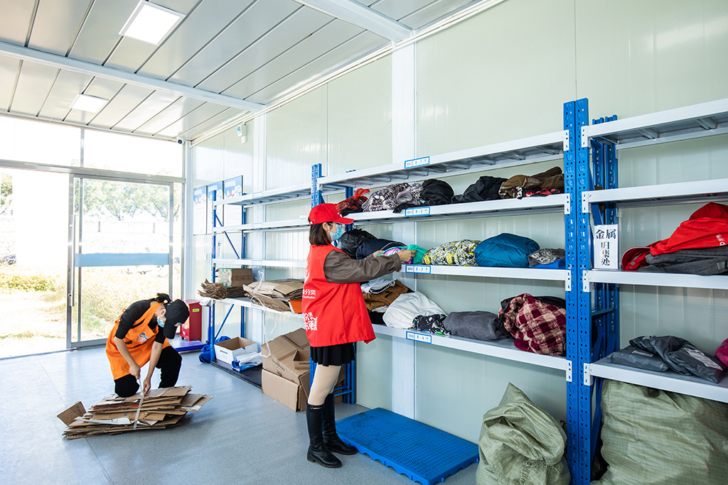 工作人員和志愿者正在整理貨架,放置可回收垃圾。