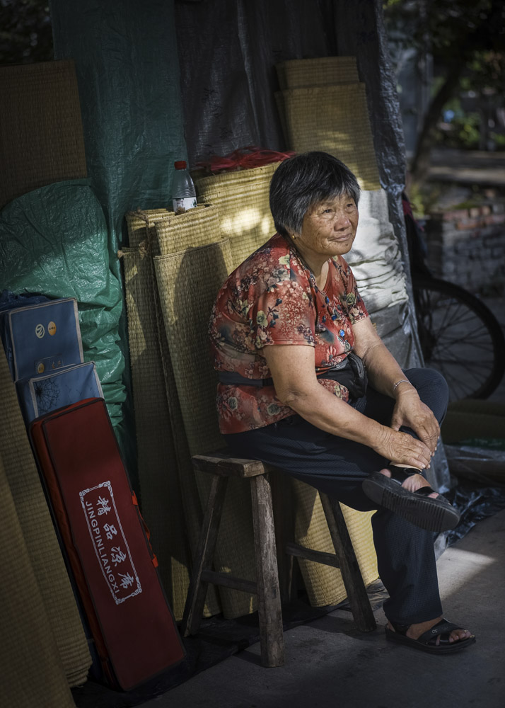 《曬太陽》 賣草席的老奶奶,悠閑地曬著太陽