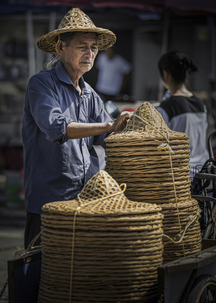 《賣斗笠》 帶著斗笠的老大爺在等待著顧客