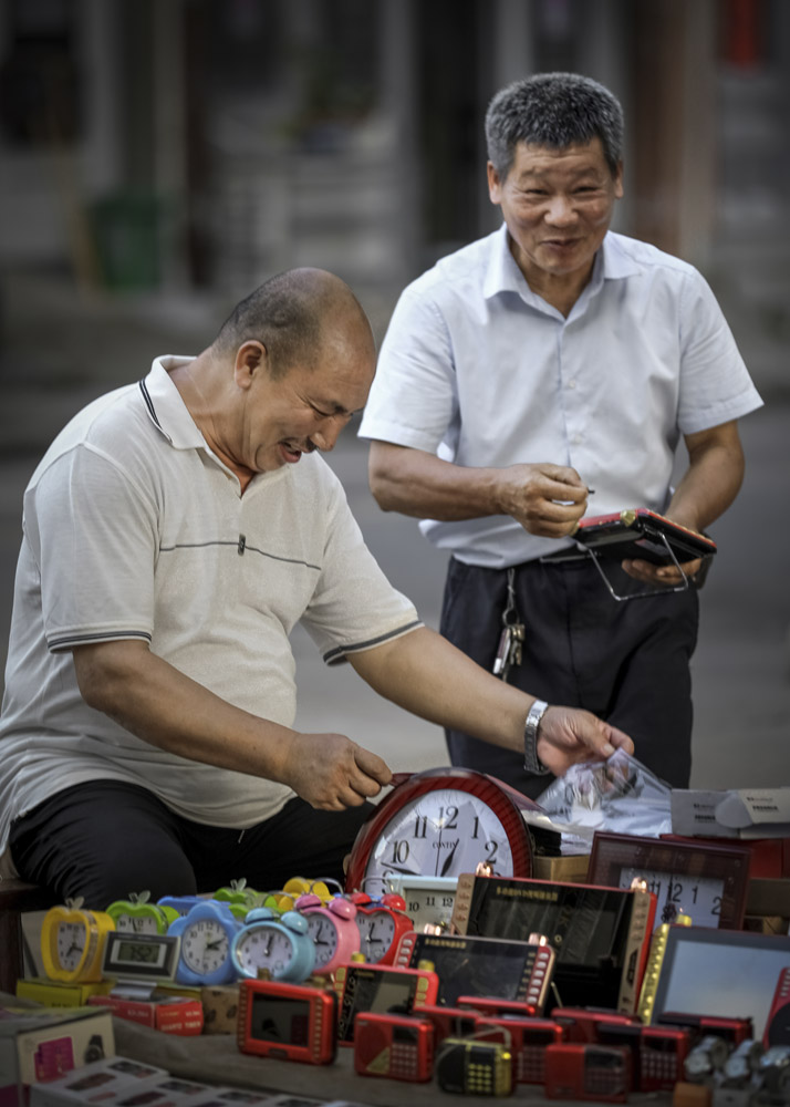 《販賣》 鐘表商販在和一旁的老人家教堂