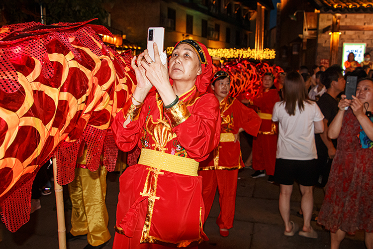 本照攝自2022年7月30日,黃巖嶼頭鄉(xiāng)舉辦的柔川旅游文化節(jié)開幕式。一位年過六十的老太太參加當夜開幕式的舞龍表演,并乘表演前的空隙時間拿出手機來一張自拍,我立刻抓拍了一張。