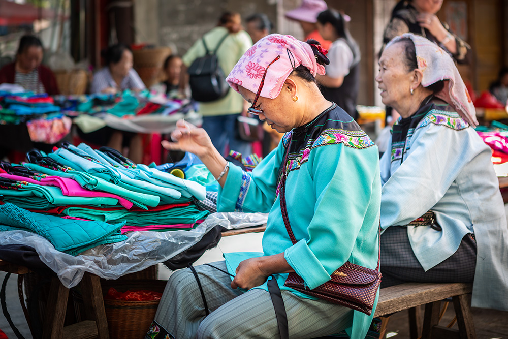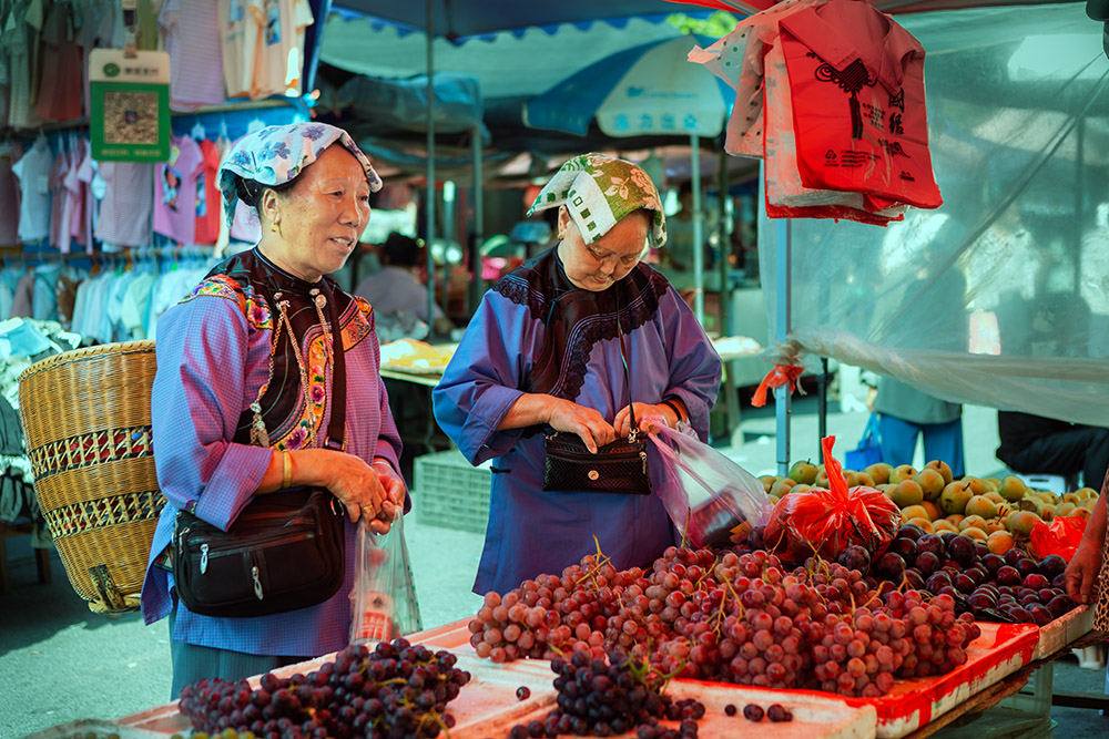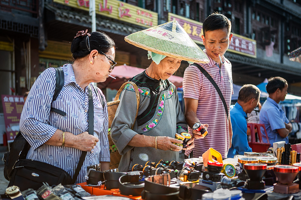 作品介紹: 熱鬧的鳳凰縣集市上,來(lái)趕集的群眾絡(luò)繹不絕。他們以苗族為主,身穿民族服裝,背著竹簍,仔細(xì)選購(gòu)自己和家人們的生活用品。