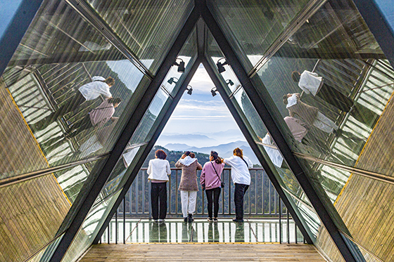 幾個(gè)姑娘站在觀景臺(tái)上欣賞羊巖山茶園美景,身影被映射到三角亭子的玻璃幕墻上,形成了有趣的幾何構(gòu)圖。