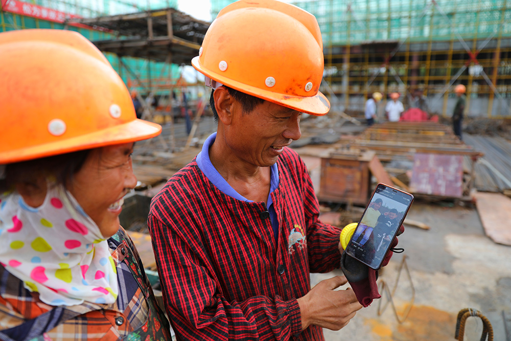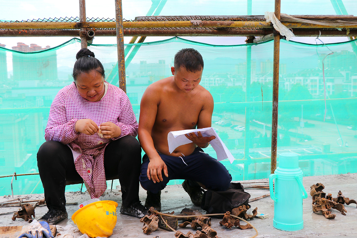 返回頂部>> 照片說(shuō)明: 4.2018年8月27日上午9點(diǎn)零5分,天氣炎熱,來(lái)自云南28歲鉗子工王偉趁著勞動(dòng)的間隙,正在認(rèn)真地看施工圖紙,新婚不到一年的妻子幸福坐在旁邊,一邊說(shuō)話一邊剝桔子。