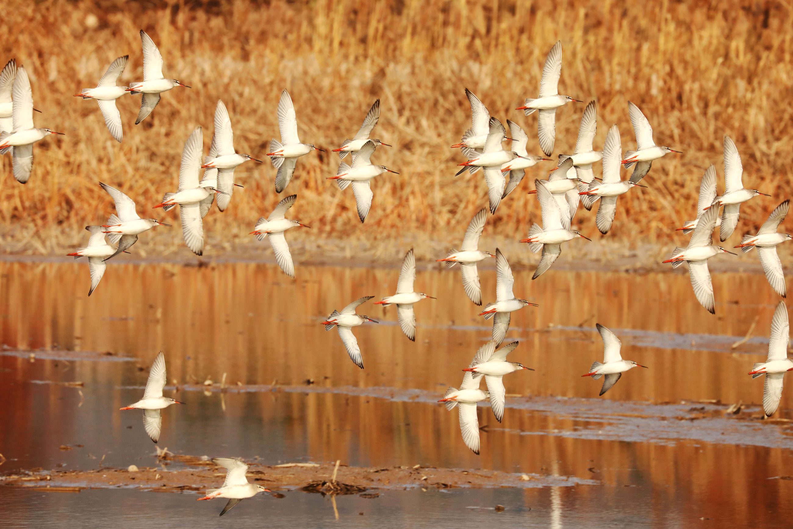 在廣袤的濕地公園上,一群鳥兒宛如靈動的音符,驟然奏響了天空的樂章。它們舒展著矯健的翅膀,身姿輕盈而優(yōu)雅。陽光傾灑在它們的羽翼上,閃爍著璀璨的光芒。