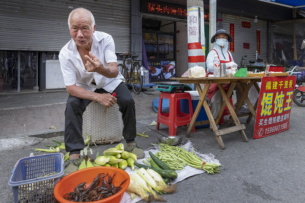 6-2 擺地攤賣龍蝦的阿公與賣餛飩的阿姨在和諧的柱子前,顯得更和諧。