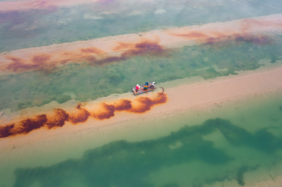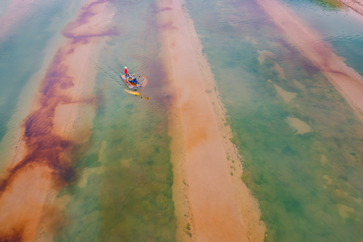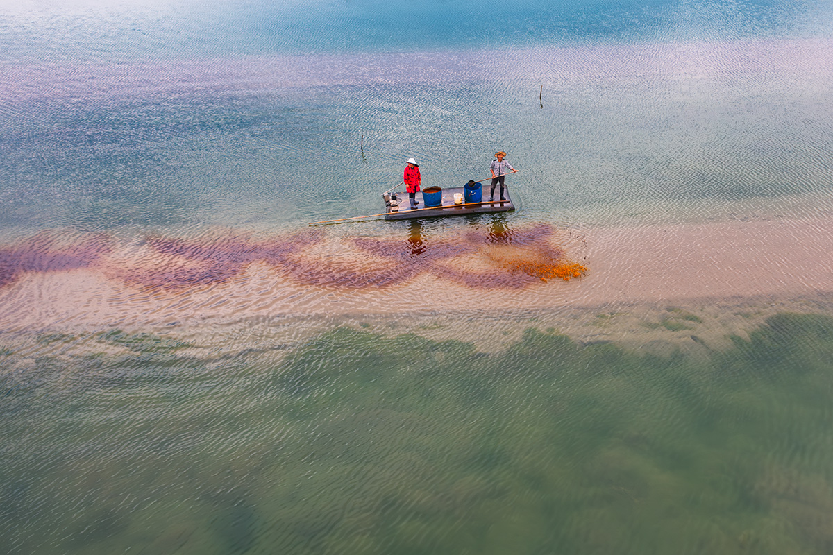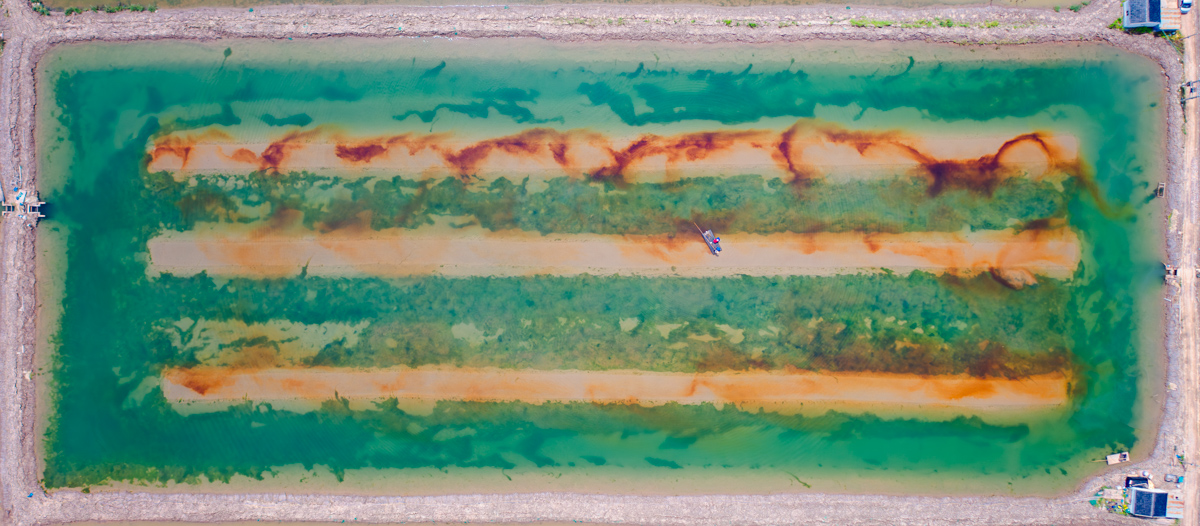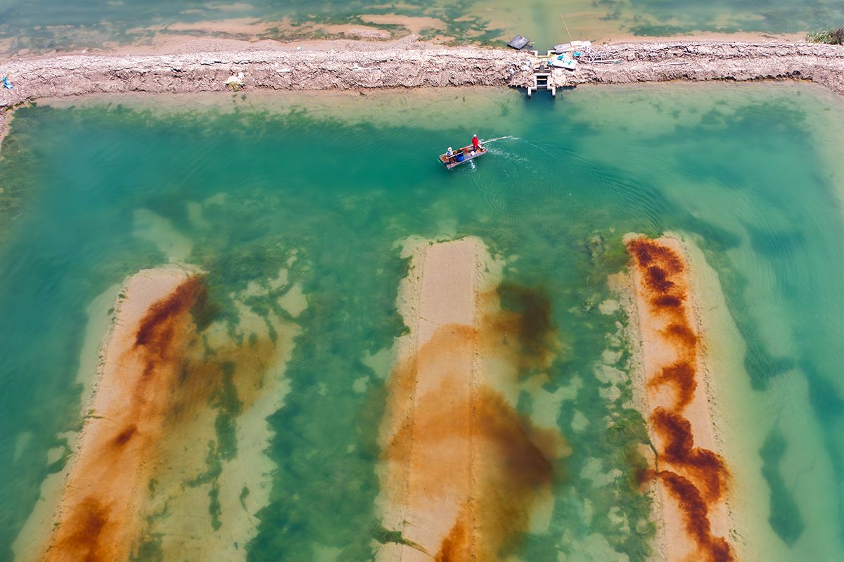 三門的一個養(yǎng)殖塘里,一對夫婦正在塘里撒料喂養(yǎng),肥料拋撒在水里,棕色慢慢四散,與綠色的養(yǎng)殖塘相呼應,格外引人注目,好像在畫水彩畫一般。