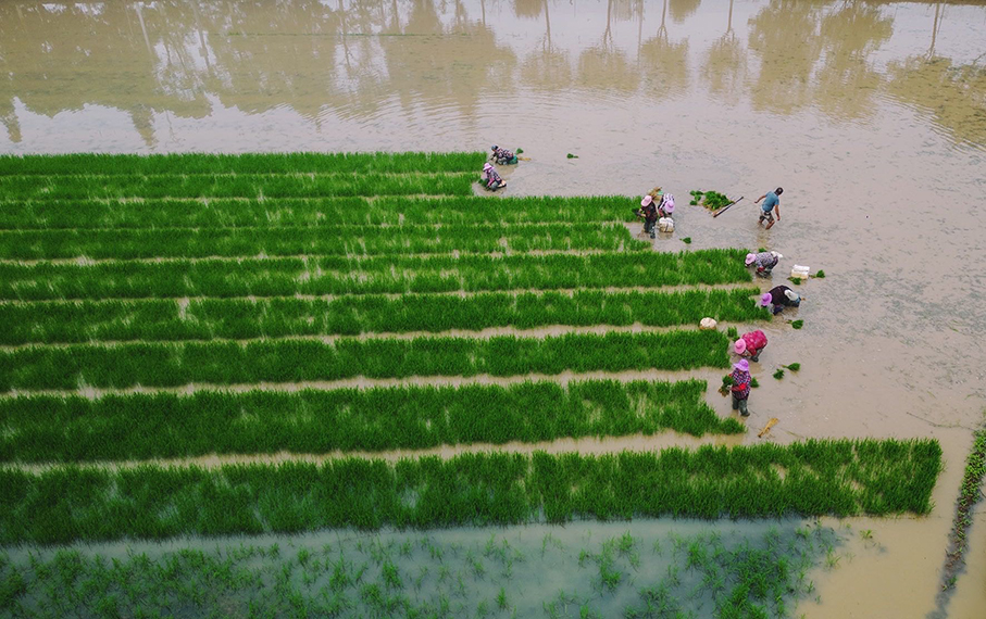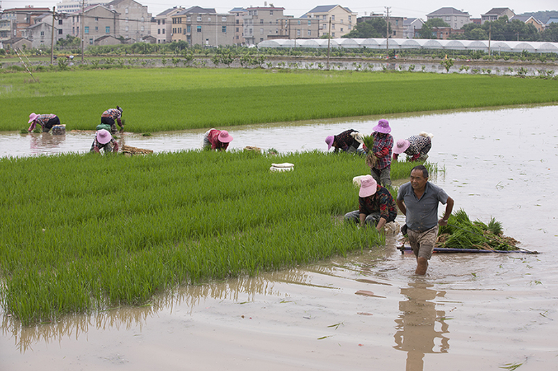 在溫嶺市城南鎮(zhèn)彭下村,農(nóng)民們忙著起秧、運秧、插秧,田間地頭呈現(xiàn)一派繁忙的景象,成為夏日里的一道美麗風景。