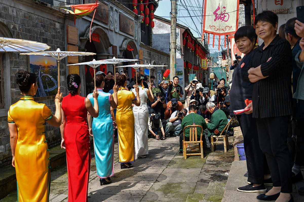 旗袍秀在章安老街上演,眾多攝影師全神貫注地定格每一個(gè)精彩瞬間,周圍的老百姓們也被這場視覺盛宴所吸引,大家共同見證著傳統(tǒng)與現(xiàn)代的交織。
