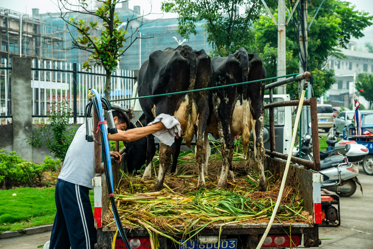 奶農(nóng)對(duì)奶牛進(jìn)行衛(wèi)生清理場面