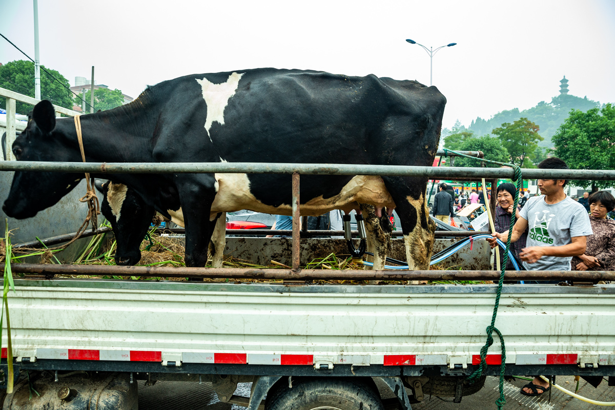奶農(nóng)把奶牛用車?yán)讲耸虚T口