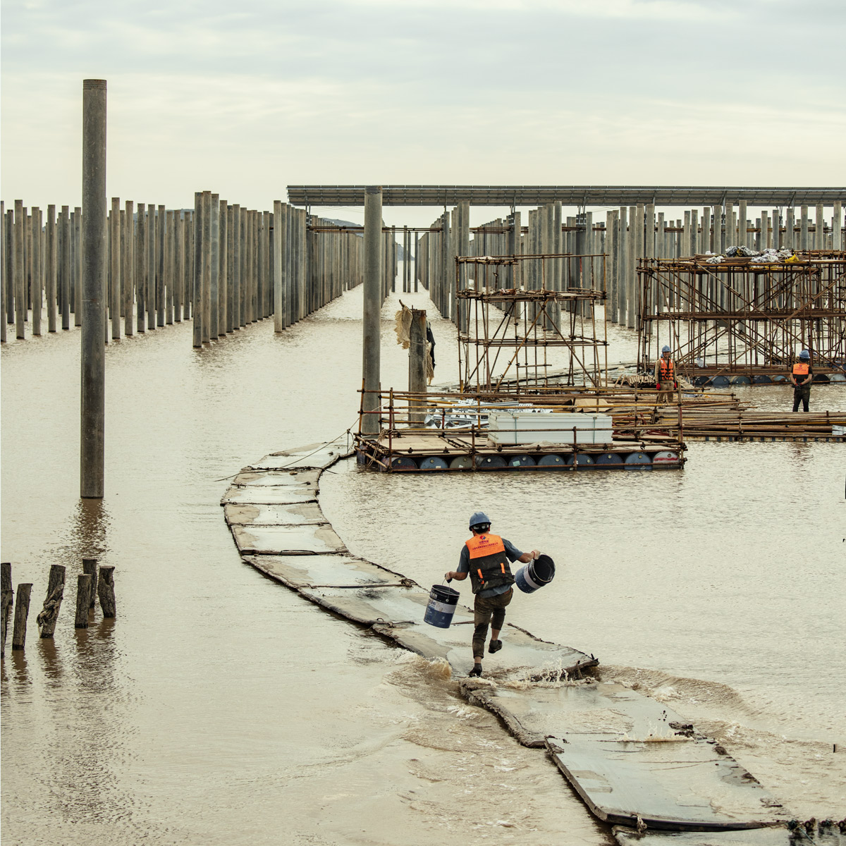作品介紹: 本人能注意選擇即將來(lái)臨的題材,拍攝于2023年11月6日下午,拍攝地點(diǎn)松門(mén)鎮(zhèn)木耳村外海,利用特定的場(chǎng)景(在松門(mén)鎮(zhèn)木耳村外海建造光伏發(fā)電現(xiàn)場(chǎng))、特殊的人物(外來(lái)打工者小年輕),在漲潮來(lái)時(shí),提著桶,小跑步在軟體浮板上,抓緊工作,促成更好地完成今天預(yù)定的工作。