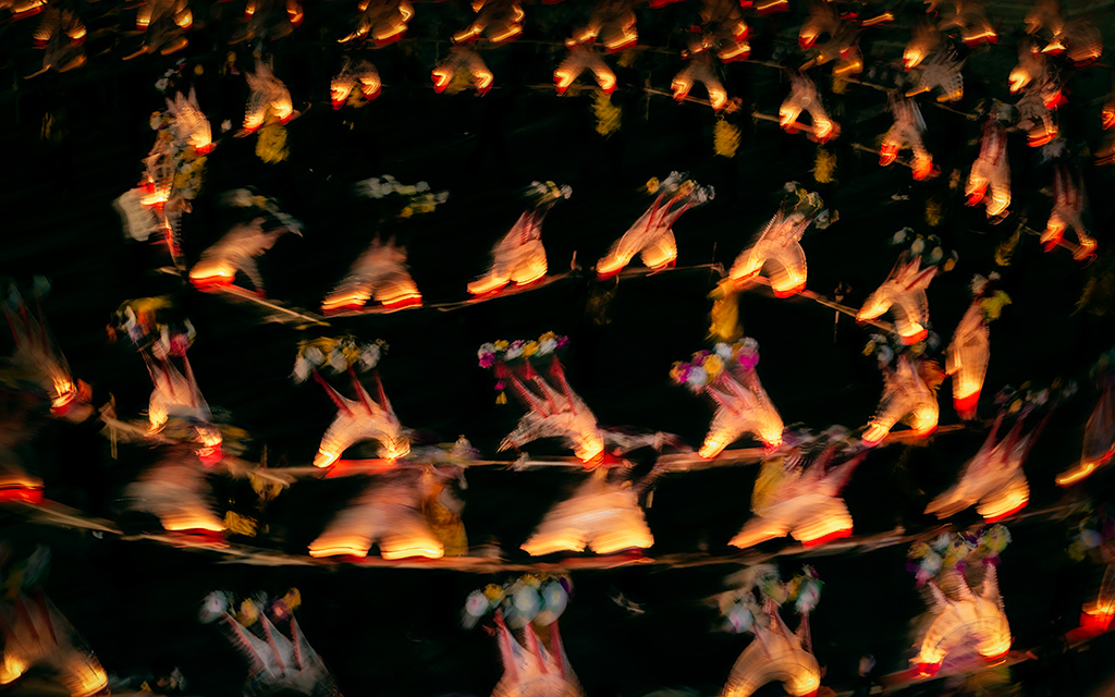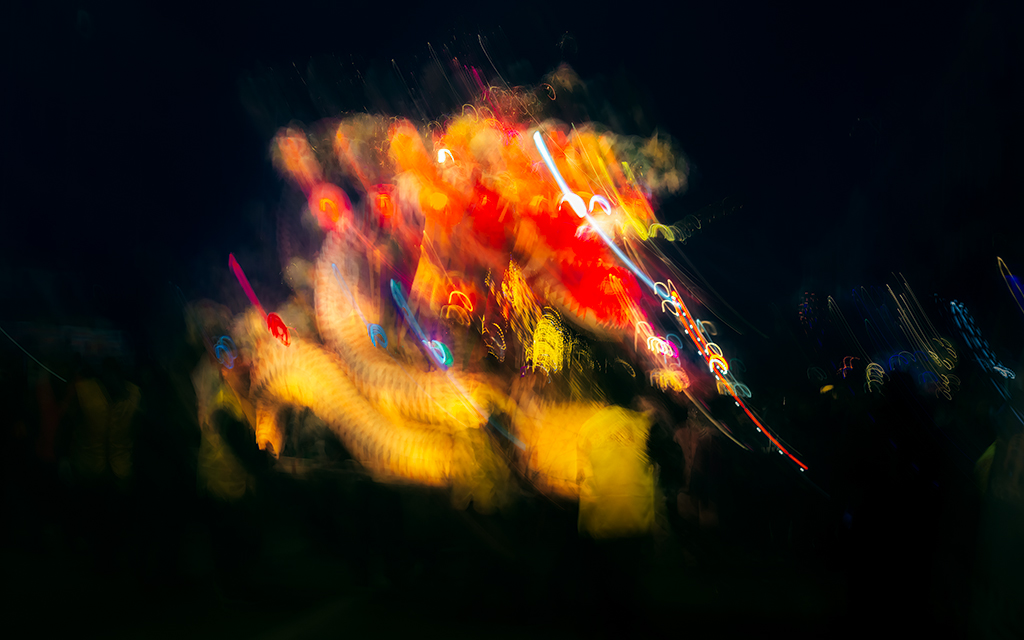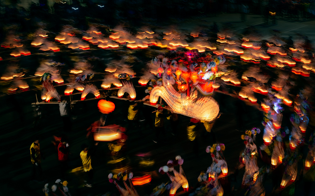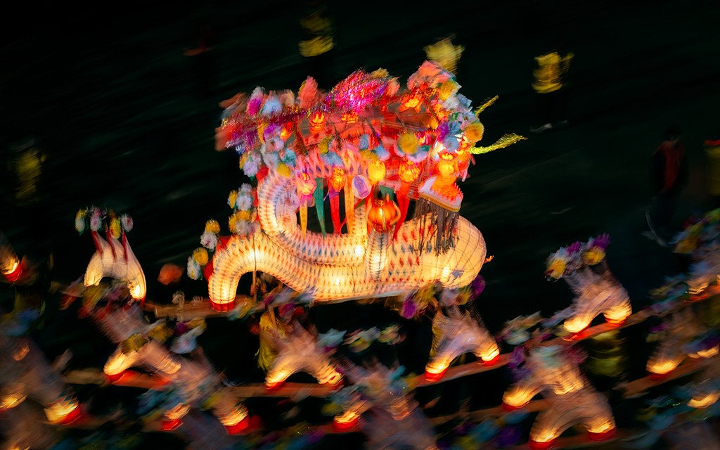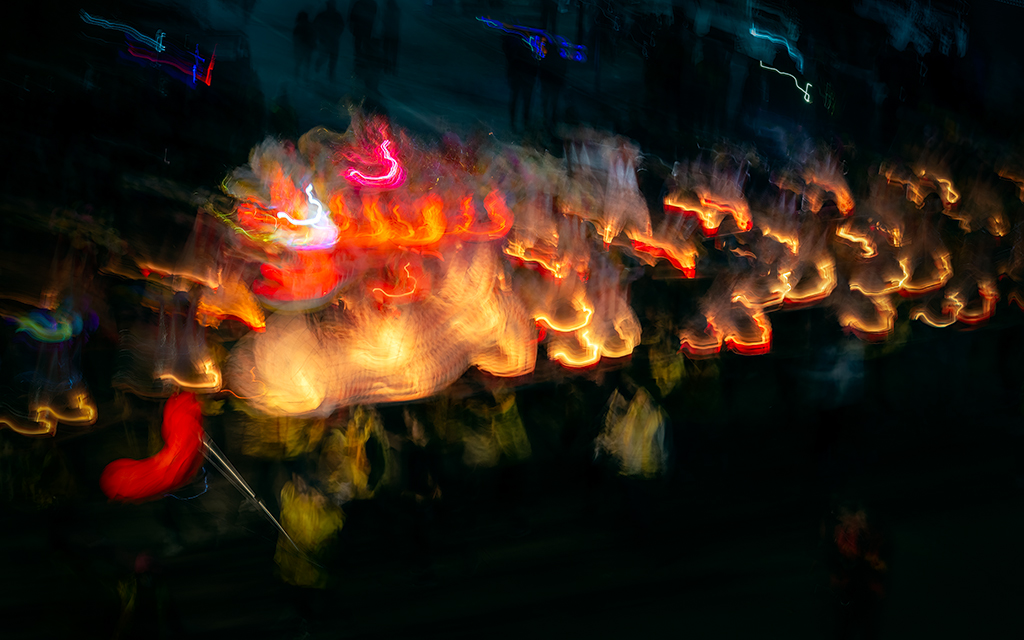 《中國龍2024》組照說明: 2024年2月16日,拍攝于仙居縣橫溪鎮(zhèn)的板凳龍鬧元宵活動,采用慢門追隨搖晃的手法拍攝。相機(jī)的移動增強(qiáng)了舞龍場景的動感,光影中透著油畫般的質(zhì)感,帶來一種質(zhì)樸、飄逸、靈動的視覺體驗(yàn)。