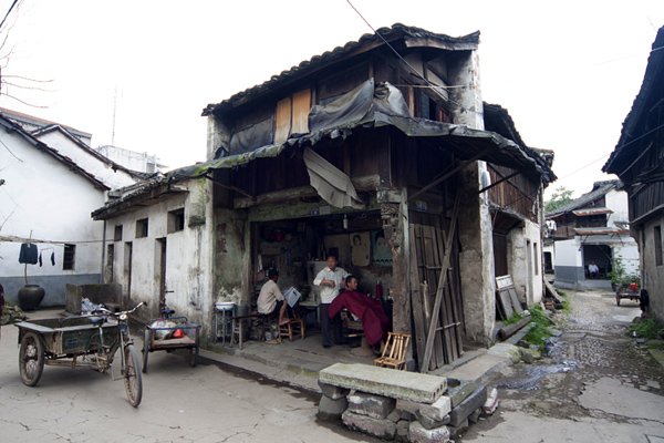 2012年6月7日,攝于嵊州市崇仁古鎮(zhèn)街上。據(jù)老理發(fā)師說,他在這地方開的這個(gè)理發(fā)店已經(jīng)有三四十年時(shí)間了,那些顧客也是固定不變的。這理發(fā)師堅(jiān)持老手藝幾十年不變而不為時(shí)尚所動(dòng)的精神很難得。