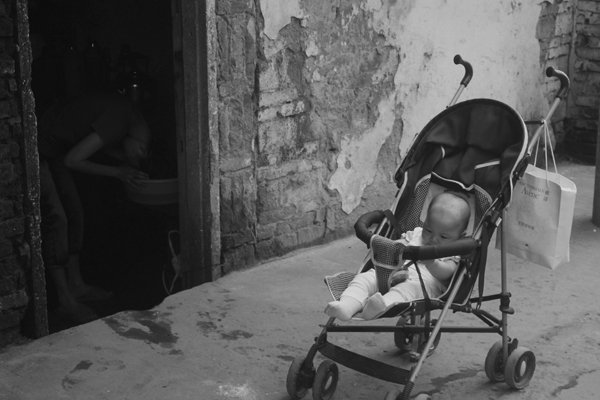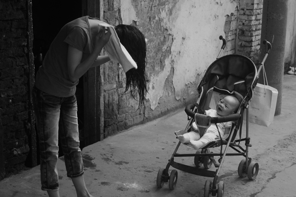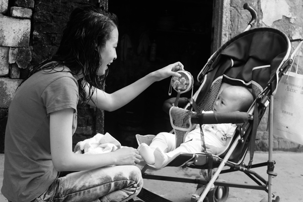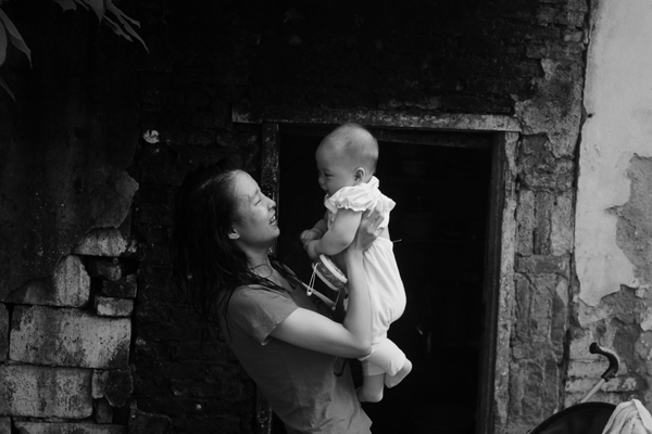 在2012.6.9拍攝于杭州秋濤路老鐵路旁棚戶區(qū)。一個年輕媽媽在簡陋的環(huán)境下和孩子享受天倫之樂。生活需要快樂,快樂來自內(nèi)心。